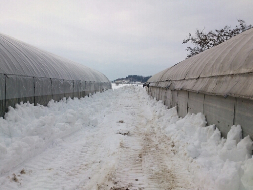 で、鶏舎は結構丈夫なパイプハウスですが、それでも雪が屋根から落ちなく成るとその雪の重みで潰れてしまうので、雪が落ちるように雪の降らない日を見計らって除雪作業。