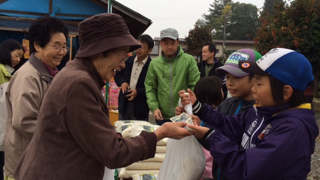 前回に引き続き、地元小学生が自分たちが刈り取ったもち米を販売します。 となりで産直センターのおじさんたちも負けじと農産物を売ります!