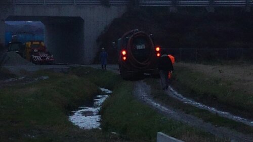 間違って狭い道に入り込んで来たとのこと。水路に落ちないように行くには、畑を少し踏んでしまうので許可を取りたいというので、地主に連絡をとってあげた。