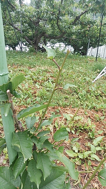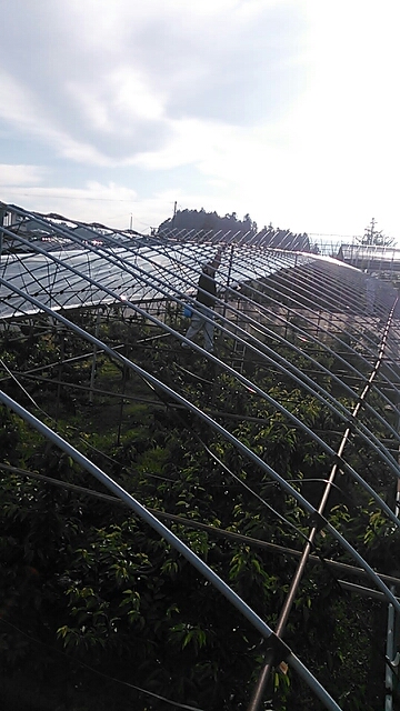 さくらんぼは色付きが近くなると雨で実割れが発生してしまうので、雨よけビニールを張ります。パイプで組んだ高さ4メートル位の足場でする作業ですので安全第一でやってます!(^_^;)