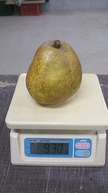 ラフランス! コメントをどうぞ 今年の収穫も終わり、ラフランスは冷蔵庫でお休み中です。 今年は生育が良く大玉傾向でした。写真は我が家の最大の物で930グラムありました。さすがにこれは大き過ぎですね(^^;)