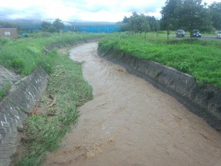 写真は15時頃の織機(おりはた)川の様子です。いつもはちょろちょろ流れているくらいなんですが、ものすごく増水してますよね。(めぐ)