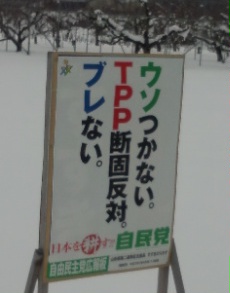 ここ最近またTPP交渉のニュースが大きく報道されるようになってきました。安倍総理は「TPPは国家百年の計」などと言ってすっかり前ノメリなようですが、そんなに重要なことが“秘密交渉”で進められているなんて不自然だし、一般庶民に知られたら不都合な何かがあるように思えて仕方がありません。きちんとした情報公開の基で議論したいところですが、やっぱり無理なんでしょうかね?本来なら政府を信頼したいところですが、前の総理大臣は公約に反して消費税増税を持ち出したし、現在政権を握る自民党は写真のポスターを掲げて選挙を戦ったのにこれだし・・・。政治が悪いのか国民が悪いのか、はたまた両方とも悪いのか?じつに悩ましいところです。