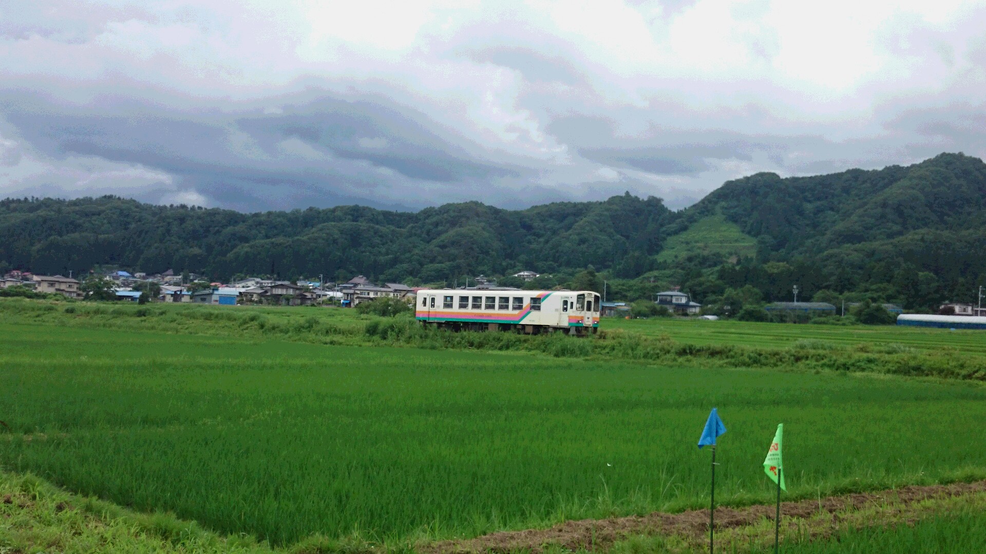 私の田んぼは長井線の線路近く(南陽市羽付)にあり、田んぼで除草作業をしていてもいつもは通る電車が通らないことにちょっと寂しさを感じていました。なので今日ふつうに電車が走っているところが見えたときにはちょっと嬉しかったですね(^_^)