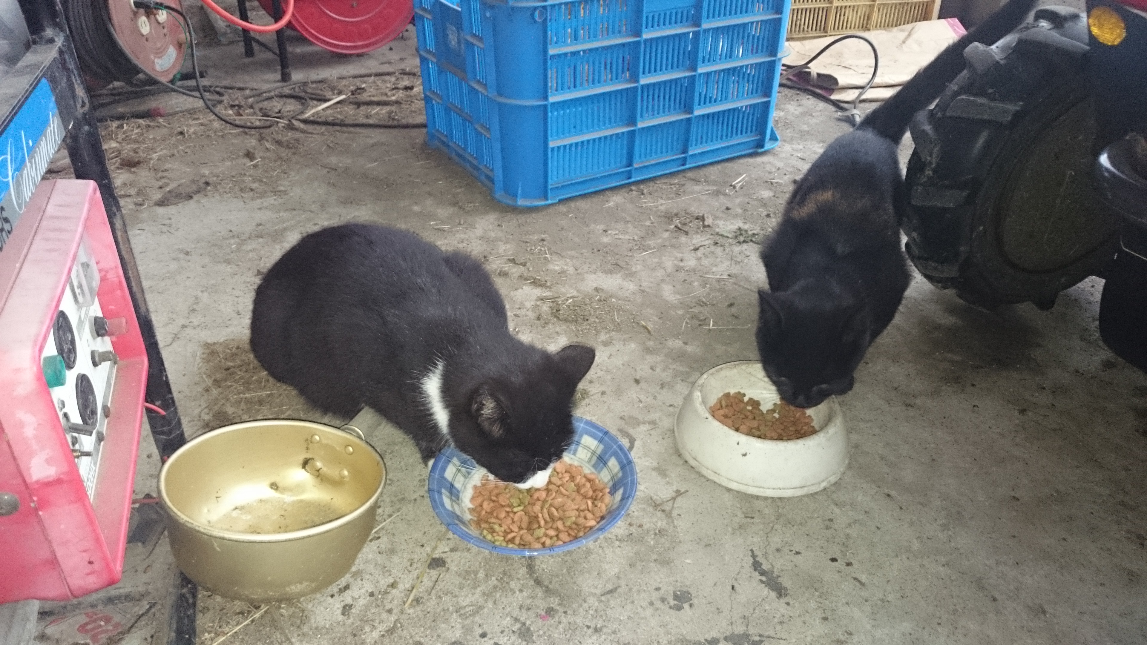 久しぶりに畑に行ったら2匹のネコがお出迎え、というかエサの催促。たぶん左側のが去年産まれたやつで右側が今年産まれたやつだと思います。母親は同じはずだから人間なら兄弟ってことになると思いますが、ネコは一緒に産まれたのを兄弟っていうような気もするし、うーん、そこら辺どうなんでしょうね?まあとりあえず仲よくしてるみたいなんでいいんですけど。