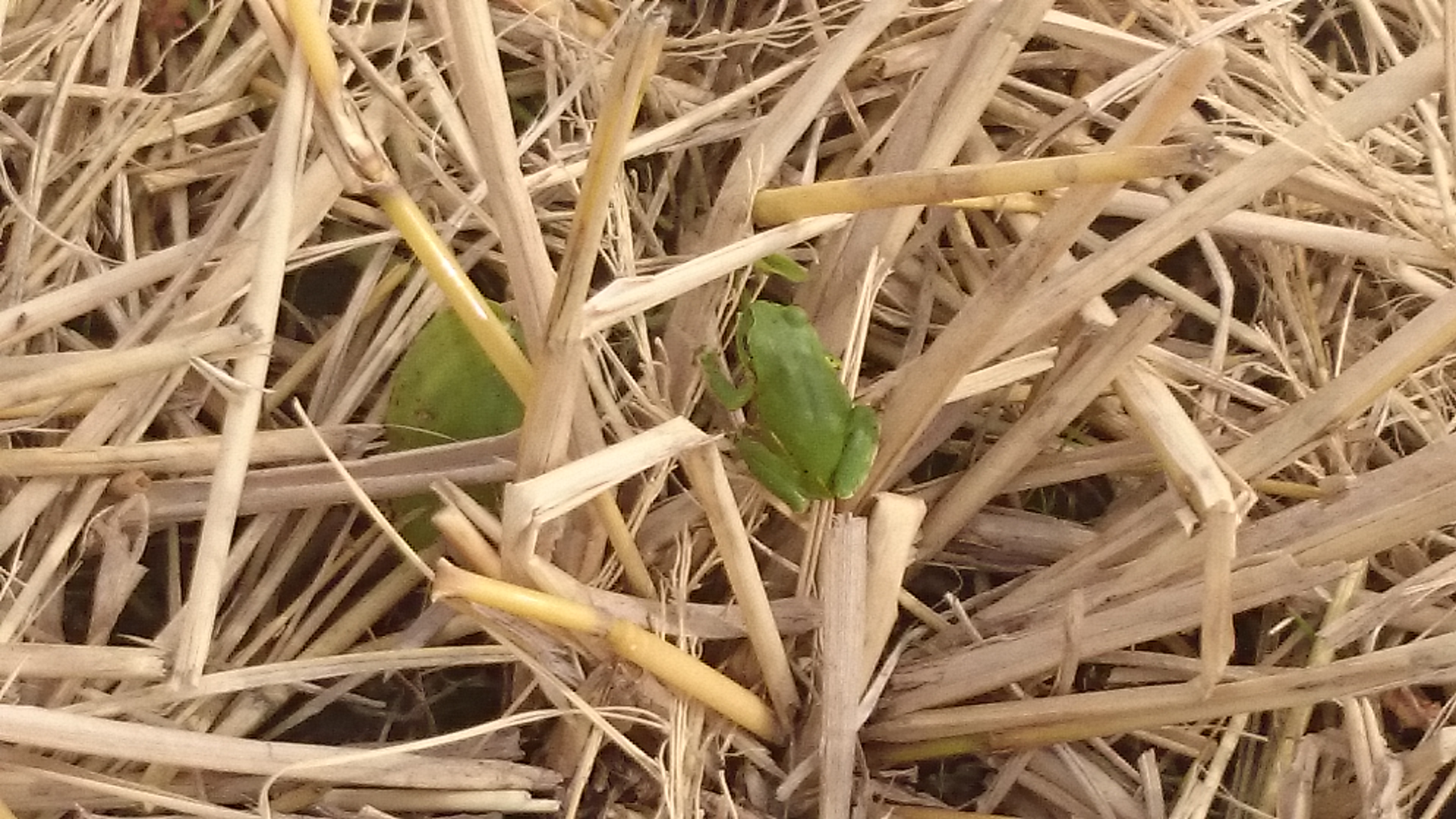生きものたち コメントをどうぞ 稲刈りも終盤戦を迎えています。うちはあと2日くらいかかる予定ですが、まずは無事終わりを迎えられればいいなと思っています。 稲刈りが進むと田んぼを棲み家にしているアマガエルやイナゴにとっては隠れる場所が無くなってしまう訳ですが、この先アマガエルは冬眠、イナゴは産卵して一生を終えることになると思います。ちょっと寂しい気もしますが、それぞれの”冬支度”ということなんでしょうね。