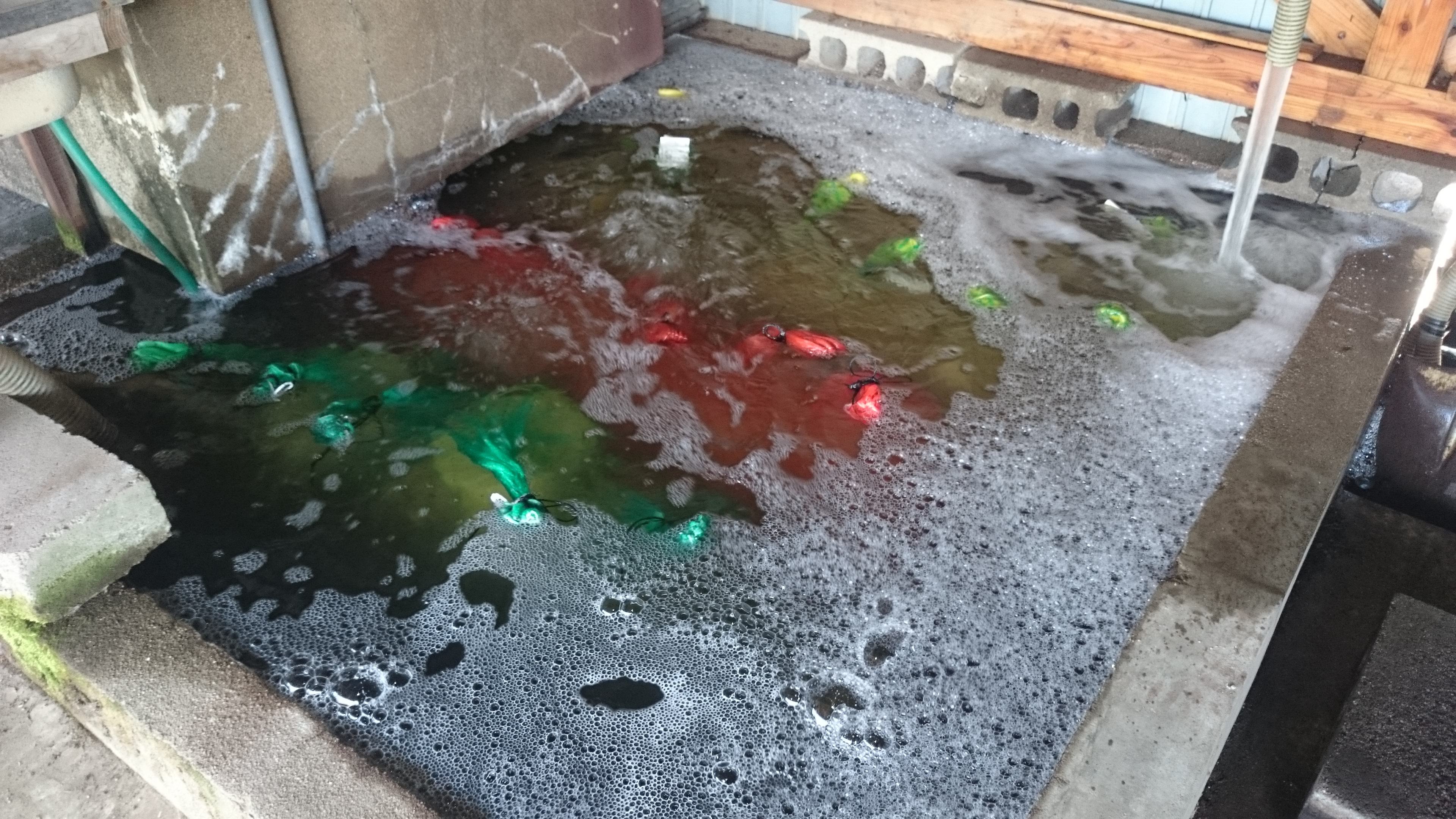 まずは温湯処理。種もみを熱いお湯に浸ける(うちは62℃7分)ことで種もみに付いている(かもしれない)病原菌を殺菌します。お湯に浸けるだけで化学農薬と同等の殺菌効果を得ることができますが、残効性はないのでその後の種もみの扱いには注意が必要です(ワラなど雑菌が付いている可能性のあるものには近づけない)。