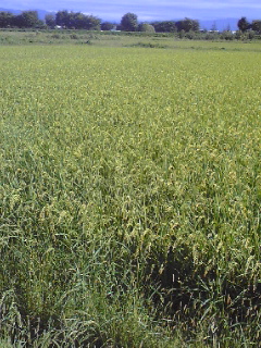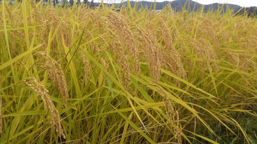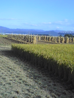 今は、画像手前の田んぼのようにコンバインで刈り取るのが一般的ですが、画像奥のように、バインダーで刈り取った稲を杭に掛けて乾燥させる人もいます。杭掛けは、乾燥ムラが無くなるように杭の上と下の稲を掛け代えたり、天候の心配があったりとなかなか大変だそうです。このように自然乾燥させた米は、機械で乾燥したものよりおいしいといわれます。ですが、今の乾燥機はかなり性能がいいですし、多分私は食べ比べてもわからないかもしれません。